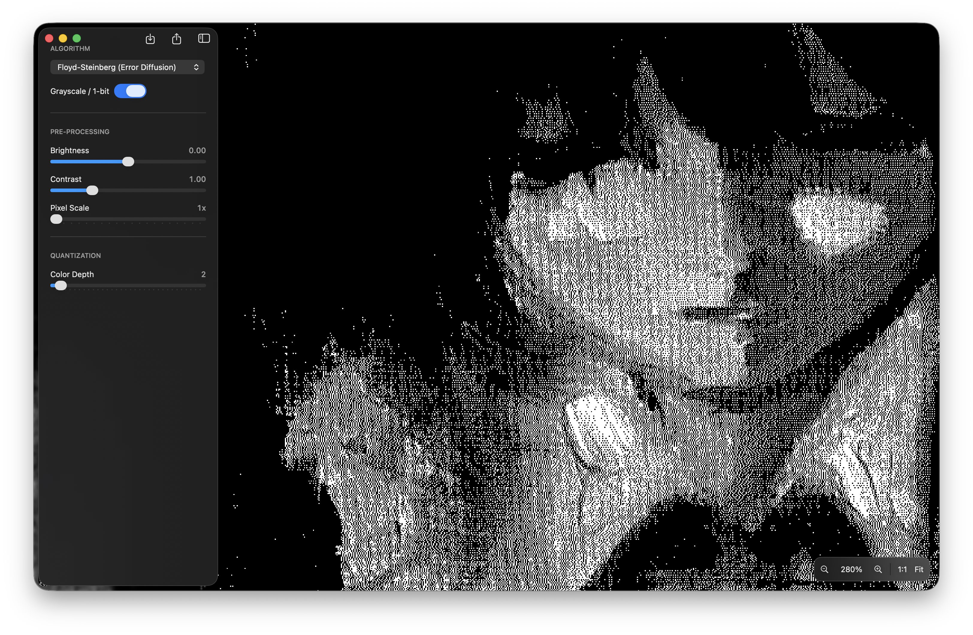 iDither est une application macOS native dédiée au traitement d'images par dithering. Elle exploite la puissance de Metal pour transformer des images en visuels rétro, lo-fi ou texturés avec un rendu en temps réel.
